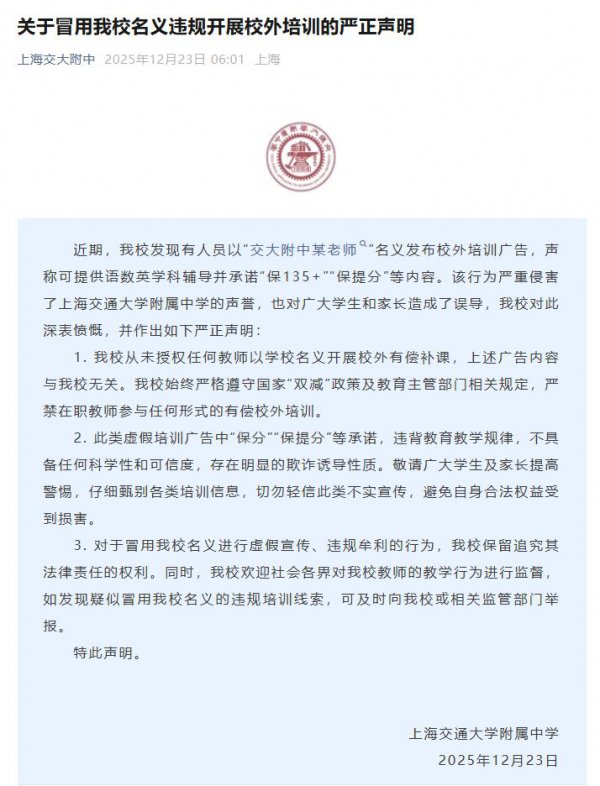 12月23日,“上海交大附中”微信公众号就有东说念主以“交大附中某诚实”方式发布校外培训告白一事发布《对于冒用我校方式违法开展校外培训的严正声明》。 上海交大附中暗示,近期,发现存东说念主员以“交大附...